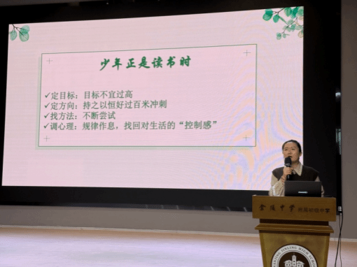 年级副组长蔡洁老师对十月份学生整体表现进行总结。她指出,本月在早读出勤、班级卫生、文明礼仪等方面进步明显,课间秩序更加规范,师生互动更加融洽。同时,她也指出部分班级存在课堂注意力不集中、作业应付、自习效率不高等问题。她强调,初一是习惯养成的黄金期,呼吁同学们增强自律意识,提升自主学习能力,合理安排作息,关注心理健康。她勉励全体学生:“起点不决定终点,努力才会有收获。”