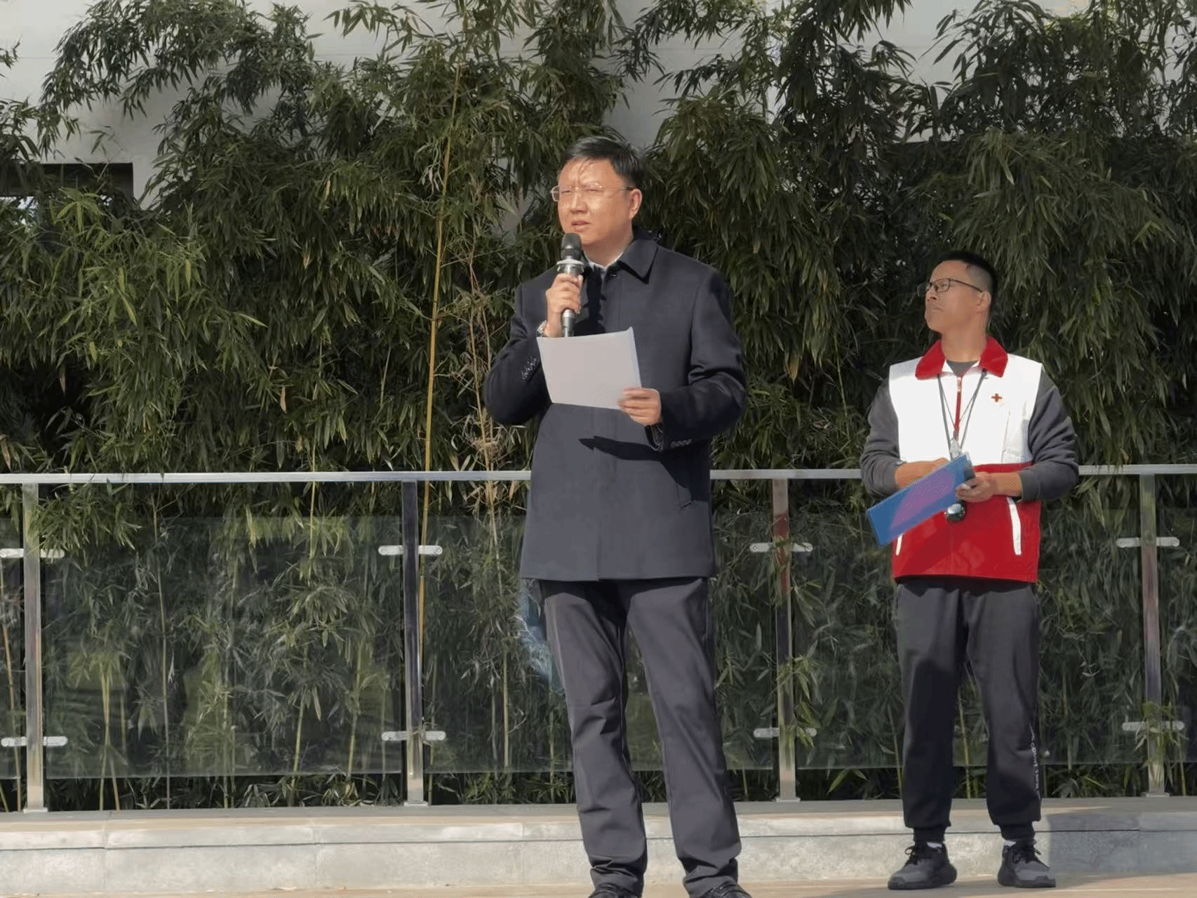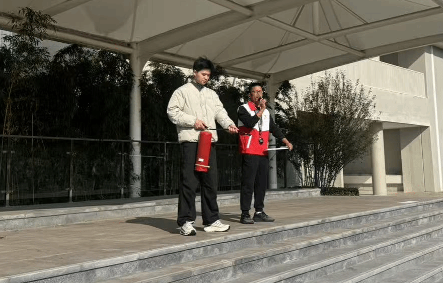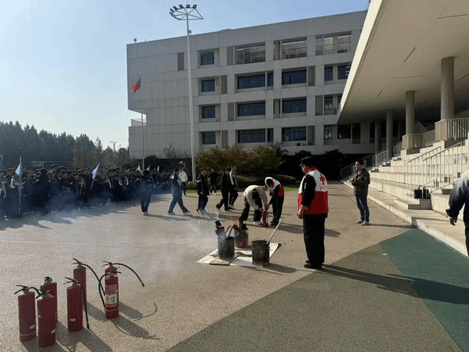 疏散结束后,蔡春来副校长对演练进行总结。随后开展灭火器实操培训,安全员详细演示了干粉灰火器“一提、二拔、三握、四压"的使用要领。在老师指导下,学生代表踊跃参与,亲身体验了扑灭初期火源的过程。