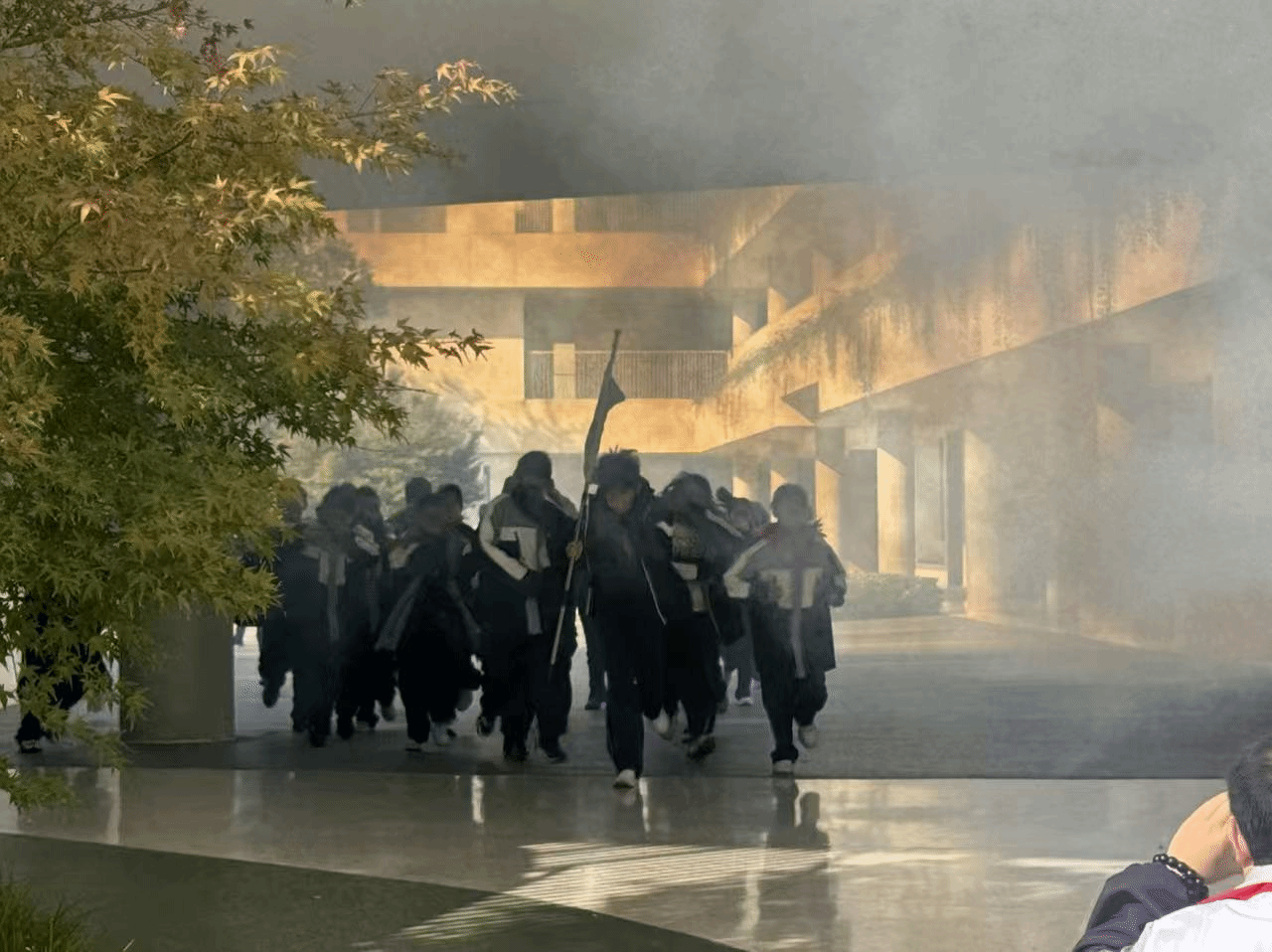 警报响起后,各楼层负责教师迅速就位,沉着指挥。全体学生按要求用湿毛巾捂住口鼻,沿指定路线快速有序撤离至操场安全区。整个过程紧张高效,数分钟内全体师生安全集结。