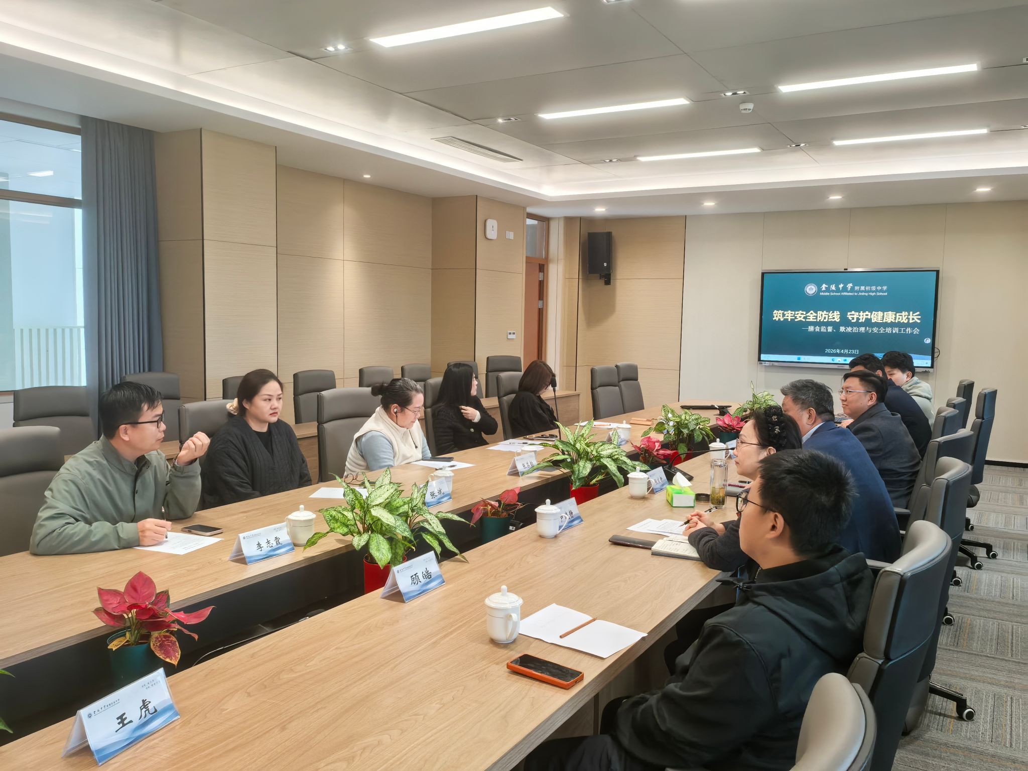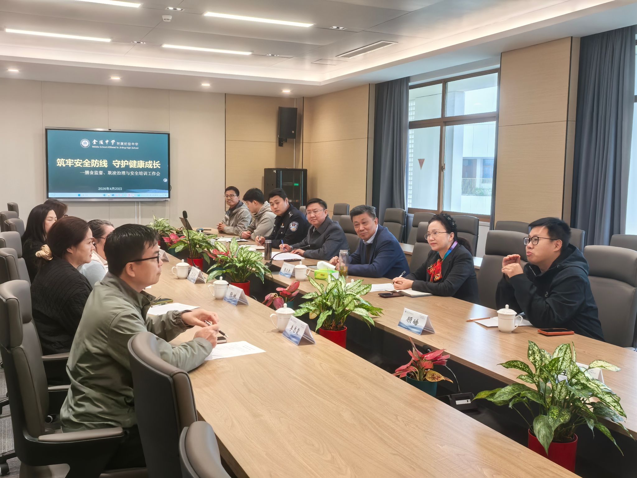 为进一步加强校园安全管理、深化家校协同育人,2026 年 4 月 23 日上午,我校在五楼大会议室召开膳食监督、欺凌治理与安全培训专题工作会议。学校校长、书记张发新,分管安全副校长蔡春来、教学副校长卢晓婧、法治副校长丁秉瑞、后勤主任李国忠、德育副主任顾皓、及各年级膳食监督家长代表共同参会,围绕学生健康与校园安全共商共议、凝聚合力。